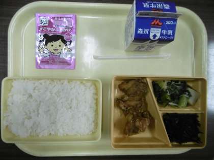 今日のメニューは、白ごはん、鶏肉の唐揚げ、チンゲン菜とえのきの和え物、ひじきの煮物、ふりかけ、牛乳です。