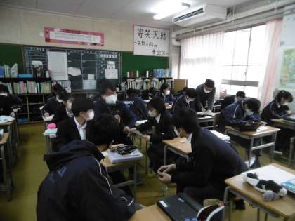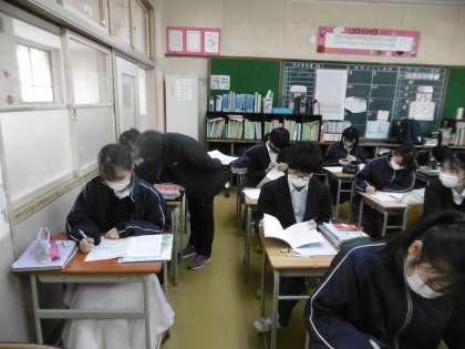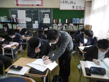 私立高校等入試の2日前になりました。今日も入試対策プリントをしていました。生徒の質問に答える先生も必死です。