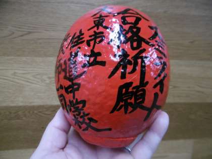 学年主任の先生が持っていただるまです。裏にはしっかり「合格祈願」と書かれていました。このだるまは先日、3年生(スミライト)に関わりのある方からいただきました。ありがとうございました。