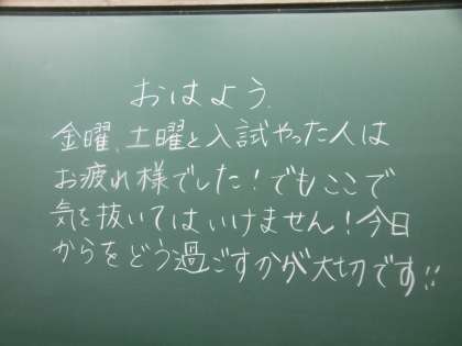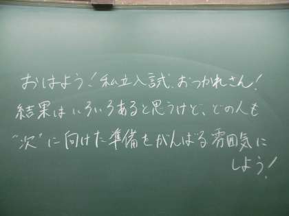 写真は3年1組と3年2組の今朝の黒板メッセージです。先週の金曜日は私立高校等の入試でした。当時はあいにくの雨で試験会場まで大変だったとは思いますが、よくがんばりました。