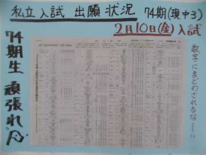 3階にも先週行われた私立高校入試の倍率が掲載された記事が掲示されていました。廊下に置いてある机の上には、家庭学習用のプリントも用意されていました。ちょうど1年後には入試を迎える75期生の子どもたちへのメッセージのようでした。