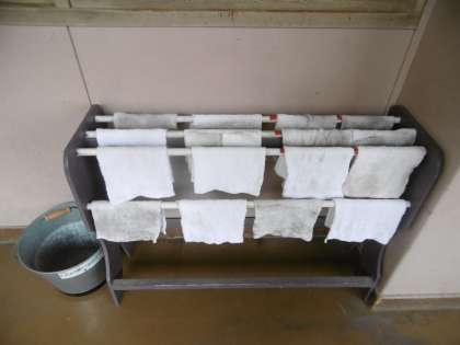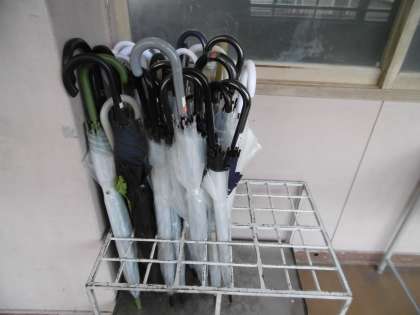 写真は3年2組です。廊下にある雑巾と傘が整然と並べられていました。とてもきれいに整頓されていて感心しました。
