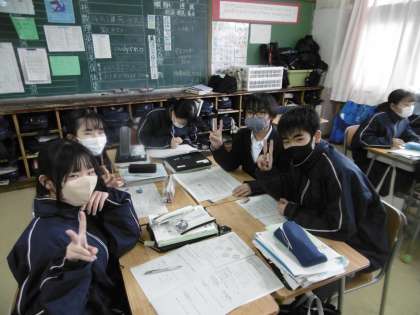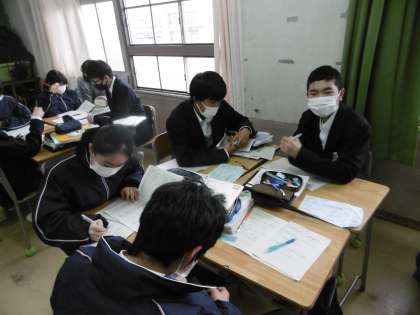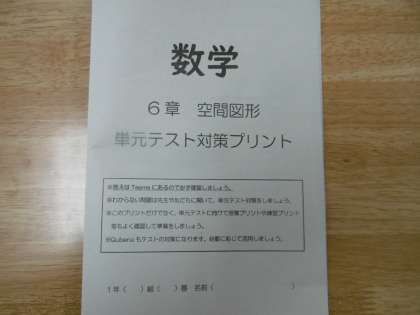 学習内容は「空間図形」でした。単元テスト対策プリントを4人班で協力しながら解いていました。学年目標の「認め愛・支え愛・高め愛」が授業でもできていました。