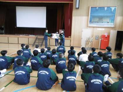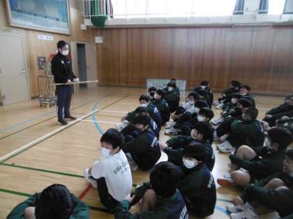 学習内容は剣道でした。見本を見せてくれた生徒の剣さばきが見事で拍手が起こっていました。1年生の先生の話を聞く態度は今日も立派でした。