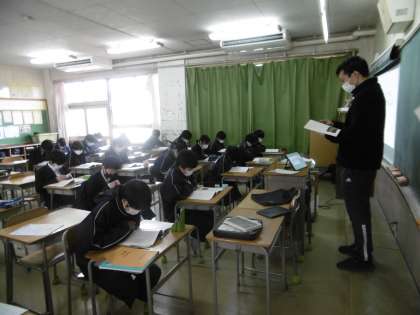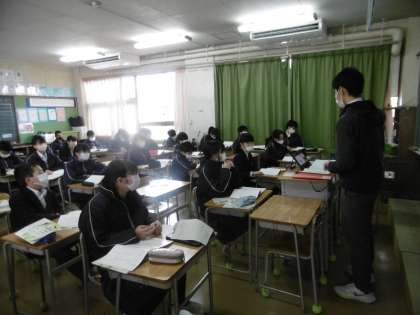 今日は各クラスで副担任が道徳の授業を行っていました。写真は上から、1年3組、1年2組です。3組では「ミスターヌードル〜安藤百福〜」、2組では「曙号の死」が学習教材でした。授業後には全員が振り返りを書くことになっています。