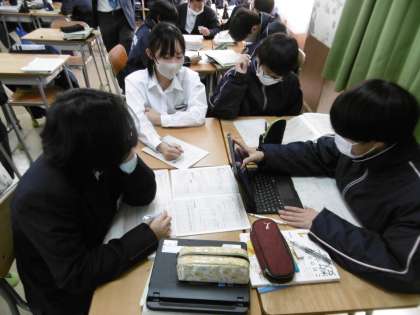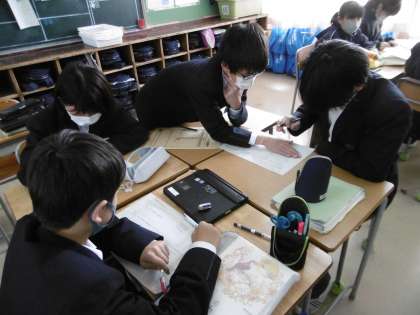 学習内容は「度数の分布とヒストグラム」でした。ここでも4人班による学び合いが行われていました。1、2年生の登校日数はあと9日になりました。