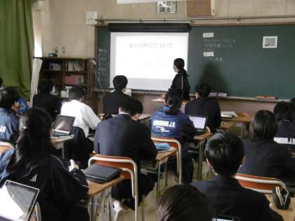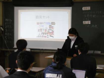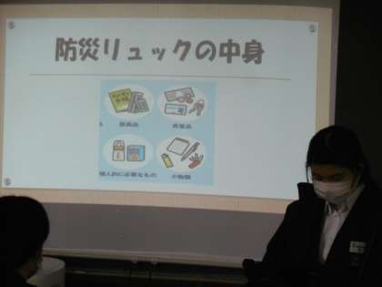 各自が防災について考え、パワーポイントを使ってクラスの生徒へ発表していました。たくさんの工夫やいろいろなアイディアが考えられていて、とても充実したプレゼン発表になっていました。やはり、子どもの考える力(発想)は無限であることを痛感しました。プレゼンテーション評価シートを使って、発表者に対してお互いに評価も行っていました。