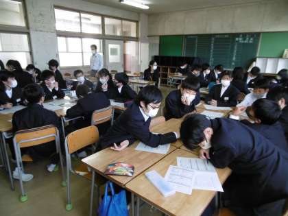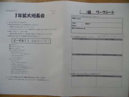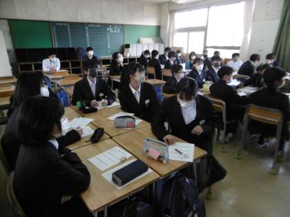 1年生は拡大班長会(各クラスの委員長と班長が全員参加する会議)を行っていました。住道中学校として、仲間づくりを大切にしていること、そのために委員長や班長にがんばってほしいことなどが担当の先生から説明がありました。77期生のやる気を感じることができるほど、子どもたちは真剣に会議に参加をしていました。