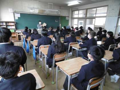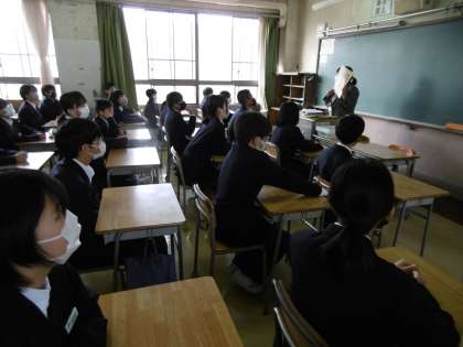 写真は1年1組です。欠席した生徒へ配付物を届けるための連絡封筒について、担任の先生がクラスの子どもたちに話をしているところです。全員が顔をあげ、まっすぐに先生を見ていました。