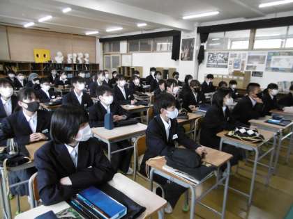 授業内容について、教科担当の先生から説明を受けていました。今日も77期生の先生の話を聞く態度は立派でした。住道中学校では、最初の授業で全教科で授業の進め方や定期テストの内容、評価方法などについて教科担当より説明(オリエンテーション)を行っています。