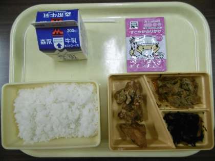 今日のメニューは、白ごはん、鶏肉の唐揚げ、豚肉とキャベツのみそ炒め、ひじきの煮物、ふりかけ、牛乳です。