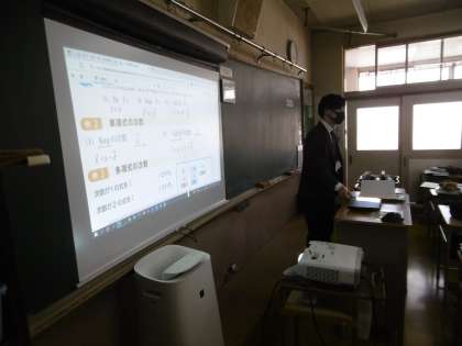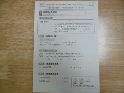 学習内容は「単項式と多項式」でした。学習プリントとパワーポイントを使って、大変分かりやすい説明がされていました。