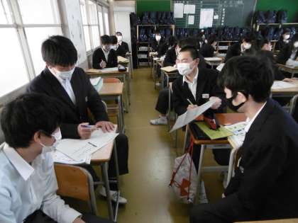 「コンピュータを使って機器を自動で動かすしくみ」についての授業でした。写真は先生の質問に対して、4人班で話し合っているところです。