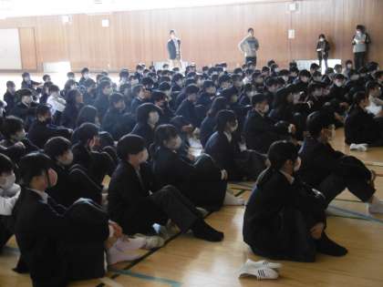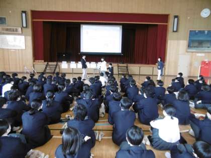 一人ひとりが感じ方の違う「心の境界線」について、先生方がいろいろな場面を想定しながら演じていました。本校では人権学習として本授業を毎年、行っています。6つの場面について、自分が嫌だと感じた場面にシールを貼り、人の感じ方については千差万別であることを学びます。授業の後半では、本校の59期生が作成した「いじめNO宣言」を76期生全員で確認しました。6つの場面とは