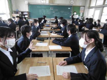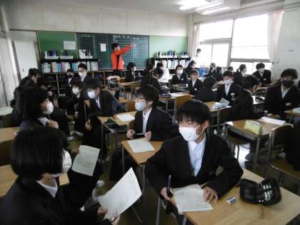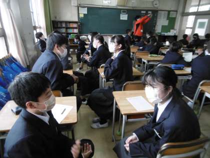 仲間を知ることを目的に1年生では「新友さんいらっしゃい!」の取り組みが行われていました。担任の先生の「新友さんー!」の呼びかけに、クラスの生徒が「いらっしゃい!」の大きな声で返事をして、2人1組で行う1分間の交流タイムがスタートします。お題(話す内容)はその都度、担任の先生が発表します。発表後にはワークシートにお互いがサインをして、次の仲間の交流タイムへと進んでいました。大いに盛り上がった学級特活でした。写真は上から、1年1組、1年2組、1年4組です。