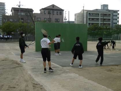 1年生の部活動体験入部が3日目になりました。写真は上から、男子テニス部、科学工作部、陸上部です。