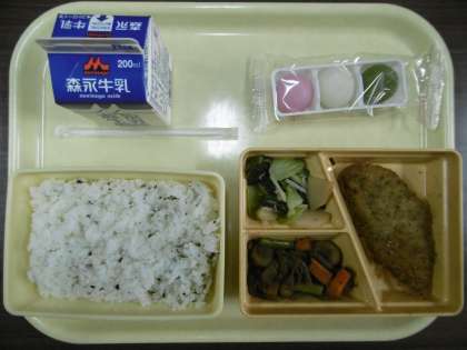 今日のメニューは、菜めし、あじの磯辺フライ、チンゲン菜とえのきの和え物、牛肉とごぼうの煮物、花見団子、牛乳です。
