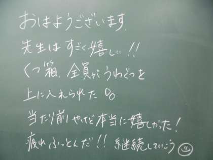 朝、校内を回っていると、黒板に書かれた素敵なメッセージを見つけました。写真は3年4組です。「継続は力なり」です。是非、続けましょう。