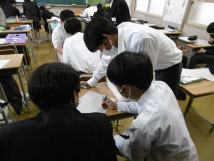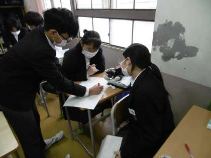1・2年生の復習プリントを使って、教え合いや学び合いが行われている授業でした。受験生として、自覚ある行動を感じることができた50分間の授業でした。