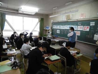 元号の歴史についての授業でした。生徒には興味深い内容だったようです。先生の話を真剣によく聞いていました。