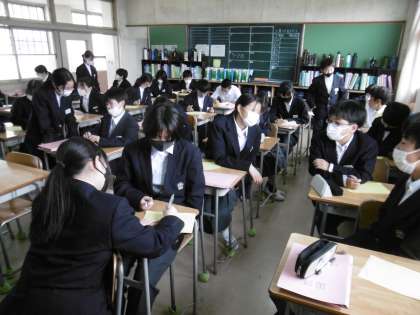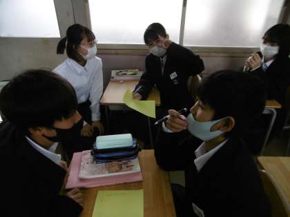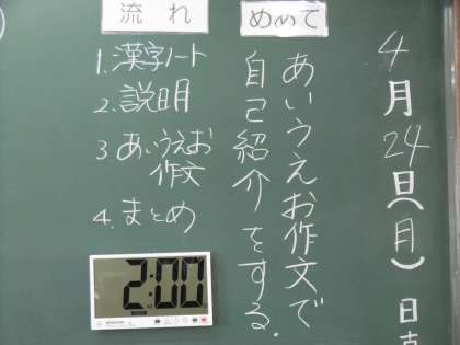 「あいうえお作文で自己紹介をする」が授業のねらいでした。班でお互いに考えた内容を発表しあっていました。やはり、子どもの考える力(発想)は無限です。大人では考えつかない内容が教室中を駆け巡っていました。