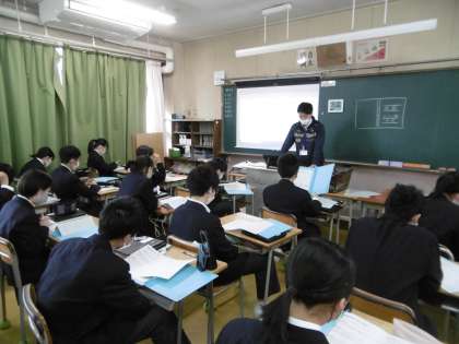 授業の進め方や評価方法などについて、教科担当の先生が説明を行っていました。先生の話をいつも静かに聞くことができる77期生の子どもたちです。