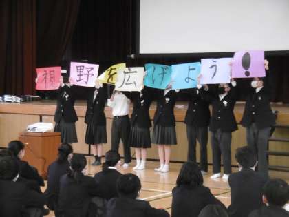 昨日に引き続き、今日も生徒会役員進行による集会が行われました。2・3年生委員長会、保健委員会、校風委員会から、先日の実行委員会で話し合われた内容について、趣向を凝らした発表がありました。今日も住中生の話を聞く態度は大変立派でした。