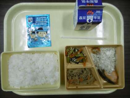 今日のメニューは、白ごはん、鮭のマヨネーズ焼き、挽肉と小松菜のにんにく炒め、ふりかけ、牛乳です。