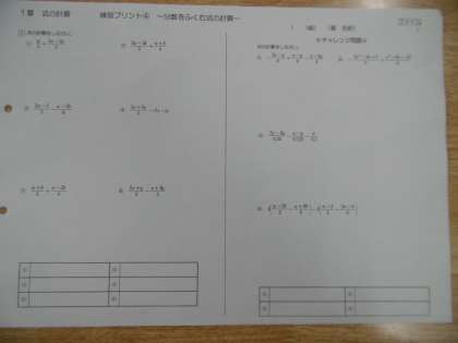 学習内容は「分数を含む式の計算」でした。丁寧に作られた学習プリントがいつも用意されています。