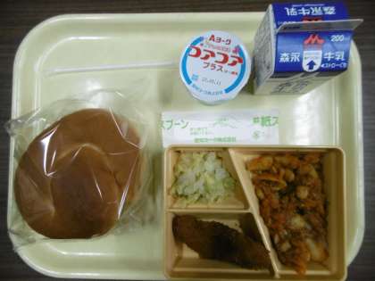 今日のメニューは、バーガーパン、チリコンカーン、米粉ささみカツソースかけ、キャベツソテー、ヨーグルト、牛乳です。