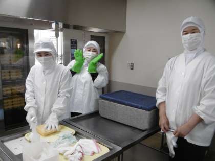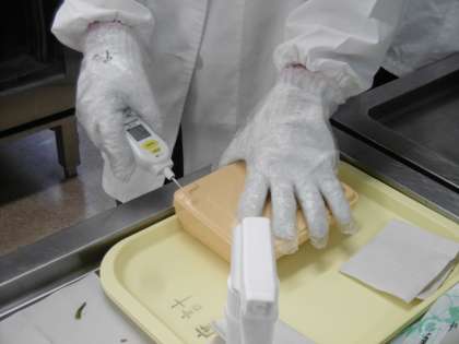 配膳室を覗くと、給食の検温(75度まで温められているかの確認)に立ち会うことができました。配膳員さんが毎日、全校生徒と教職員の給食を75度まで一度、温めてくれています。