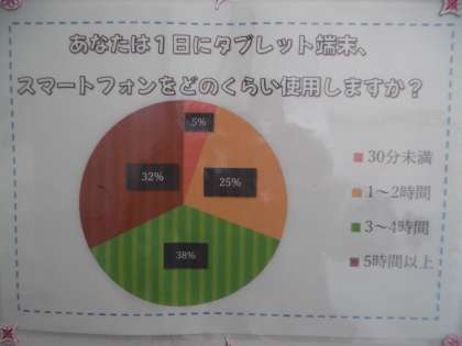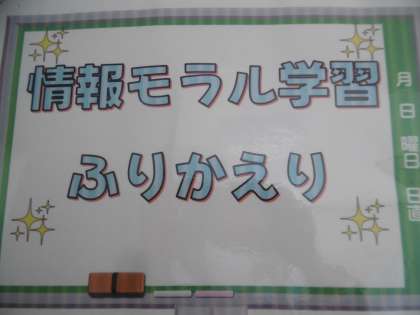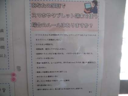 情報モラル学習の振り返りが掲示物として飾られていました。スマートフォンの利用時間や家庭でのルールが分かりやすく掲示されていました。素敵な掲示物でした。