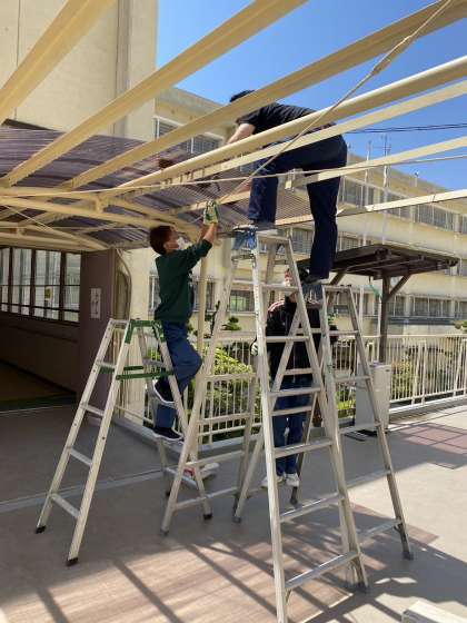 大東市の校務員さんが体育館前の屋根を新しくしてくださいました。これで雨の日も濡れずに子どもたちは移動できます。ペンキもきれいに塗り直していただきました。お忙しい中、屋根を修理してくださり、本当にありがとうございました。