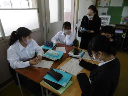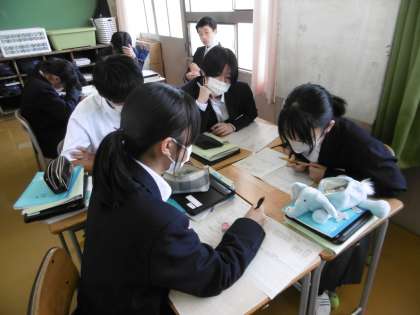 学習単元は「文字式の利用」でした。4人班による学び合いが授業で展開されていました。教え合う(説明する)活動は、学習の理解をより深めています。