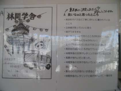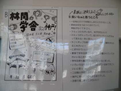 2年生のフロアーに林間学舎で使用するしおりの表紙が飾られていました。生徒が投票時に書いた心温まるコメントが書かれていて、とてもうれしい気持ちになりました。