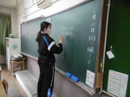 3年4組の担任の先生が教室の黒板にクラスの子どもたちにメッセージを書いているところです。笑顔でメッセージを書いていました。