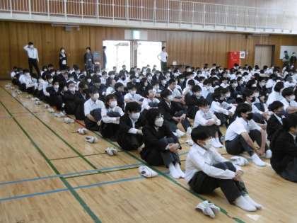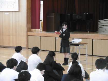 生徒会役員進行のもと、今日も時間どおりに集会が始まりました。図書委員会、保健委員会から報告がありました。図書委員会からは本の貸し出しについて、保健委員会からは手洗いについて寸劇を交えて報告がありました。