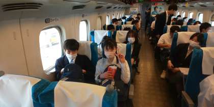 新神戸駅を通過しました。75期生のパワーはすごいです。すでに昨年の林間学舎からの成長を感じます。子どもたちが現在乗っている新幹線は、団体専用列車で、一般の方の乗車はありません。ゆったりと座席が割り当てられていて、とても過ごしやすいです。