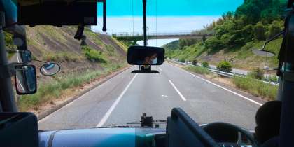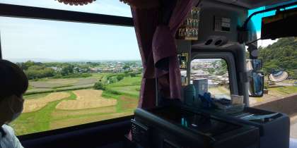 長崎自動車道を西に向かって移動しています。バスレクが始まりました。レク係が事前に録音したインタビューや、音楽を聞いています。もう少しで昼食会場に着きます。子どもたちはお腹がすいているようです。