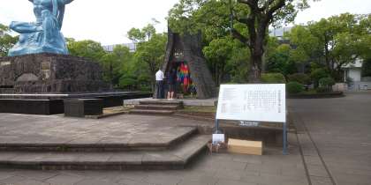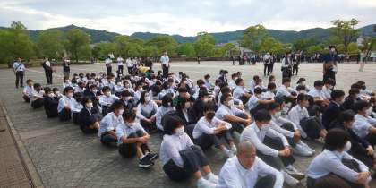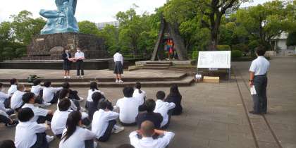 平和の集いを平和祈念像の前で行いました。実行委員が雰囲気をがらりと変えて、儀式的行事を立派に進めてくれました。平和へのメッセージを読み上げたあと、75期生全員で1分間の黙とうを行いました。全校生徒で織り上げた千羽鶴も奉納してきました。とても厳粛な雰囲気の中での平和の集いは今後への学びにも繋がりました。