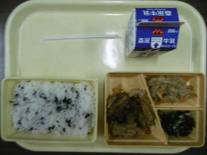 今日のメニューは、わかめごはん、鶏の唐揚げおろしソース、ごぼうサラダ、ほうれん草のしらす和え、牛乳です。
