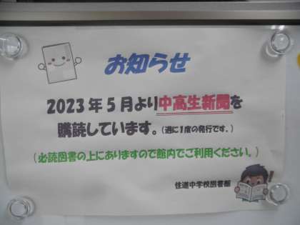 昼休みにに図書館を覗いてみました。本校には昨年度から配置された学校司書が勤務しており、毎日昼休みは図書館の開館をしています。5月より、中高生新聞を配架しています。