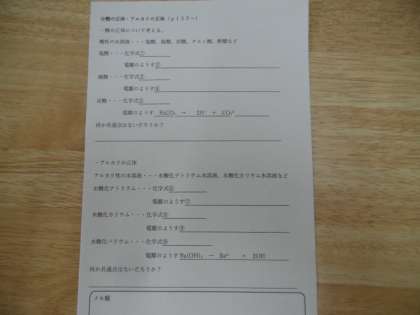 授業のねらいは、「酸とアルカリの正体について考える」でした。学習プリントとパワーポイントを使って、授業が進められていました。
