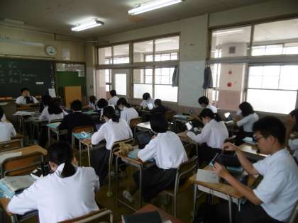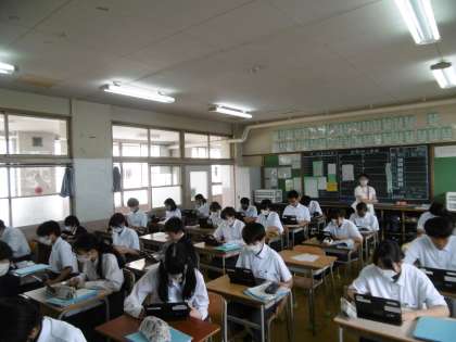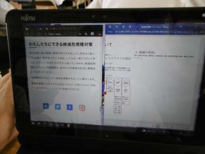環境問題について、各自でテーマを決め、タブレットパソコンを使ってWordでまとめていました。生徒は、教科書やインターネットを使って一生懸命に調べていました。