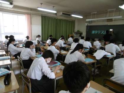 漢字テストの答え合わせをパワーポイントを使ってしていました。解答が黒板と同色に作られていて、とても見やすくなっていました。