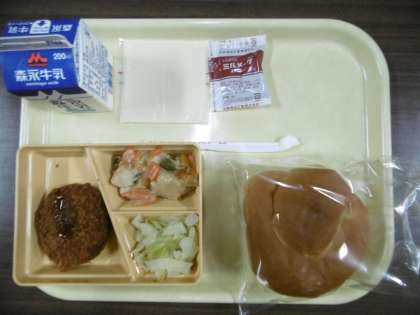 今日のメニューは、バーガーパン、ミンチカツソースかけ、ささみとピーマン炒め、キャベツソテー、スライスチーズ、ミルメーク、牛乳です。
