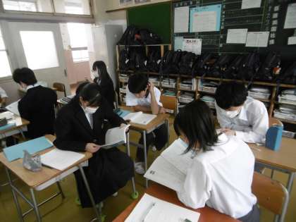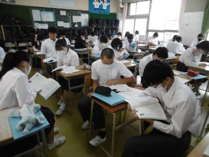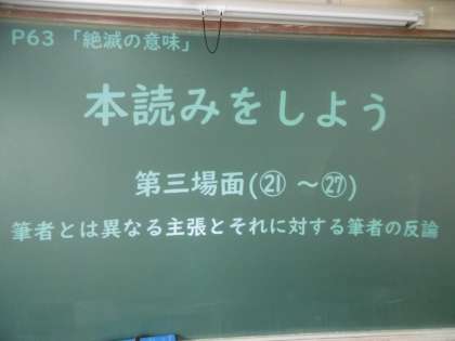 学習内容は「絶滅の意味」でした。写真はペアで本読みをしているところです。授業の流れや指示もパワーポイントを使っていつ生徒が見ても分かるように視覚的に行っていました。