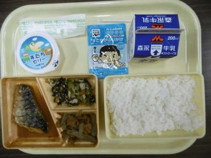 今日のメニューは、白ごはん、鯖のみそ煮、挽肉と小松菜のにんにく炒め、きんぴらごぼう、ふりかけ、すだちゼリー、牛乳です。