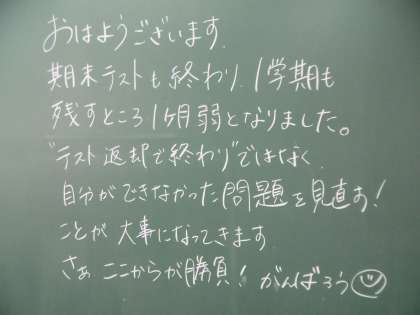 写真は3年4組の黒板メッセージです。今日から期末テストの返却が始まります。テストは「終わってからも(が)」大事です。点数のみに一喜一憂せず、1学期の残り1か月をがんばり抜きましょう。