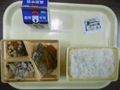 今日のメニューは、白ごはん、白身魚の野菜ソースかけ、鶏のゆずこしょう炒め、五目豆、塩こんぶ、牛乳です。